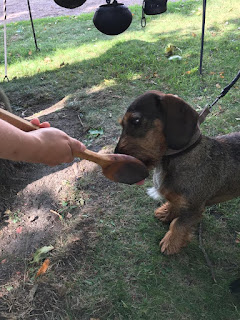 Kaupungin järjestyssäännöistä johtuen kokkaaminen kaupungin puistossa ei voinut tapahtua tuttuun tapaan avotulella, mutta varmistuksen jälkeen kaasukokkaus kävi päinsä. Meillä oli sitten viisi kaasukeitintä ja kolme kaasupulloa, ja näistä saatiinkin sitten riemua kun tuulisena päivänä liekki sammui aina vähän päästä. Patenttiratkaisuksi tuulisuojaksi kehitettiin sitten erään kokin mekko, tehtävänä henkilöllä oli siis pääosin seistä paikoillaan helmat leveänä! Alkusähläyksistä johtuen pääsimme aloittamaan jo valmiiksi hiukan myöhässä ja ruuan valmistumiset osuivat sitten aivan eri aikoihin, mutta siitäkin sitten lopulta selvittiin kun pääsi vain yli siitä, että lisukkeet eivät osuneet aivan niille ruokalajeille kun oli suunniteltu... Lopulta kävi niin onnellisesti, että lähes kaikki ruoka myytiin loppuun (jäljelle jäi vain vähän keittoa), asiakkaat olivat ilmeisen tyytyväisiä ja tätä pyydettiin uudestaankin järjestettäväksi!